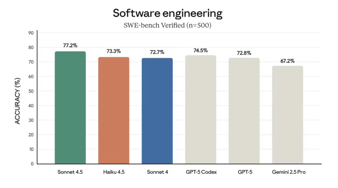 在性能方面,Claude Haiku 4.5 编码性能与 Sonnet 4 基本持平,但在成本上仅为后者的三分之一,处理速度则提升了超过两倍。据介绍,在衡量编程能力的权威基准测试 SWE-bench Verified 中,Haiku 4.5 取得了 73.3% 的高分,略微领先于 Sonnet 4 的 72.7%。