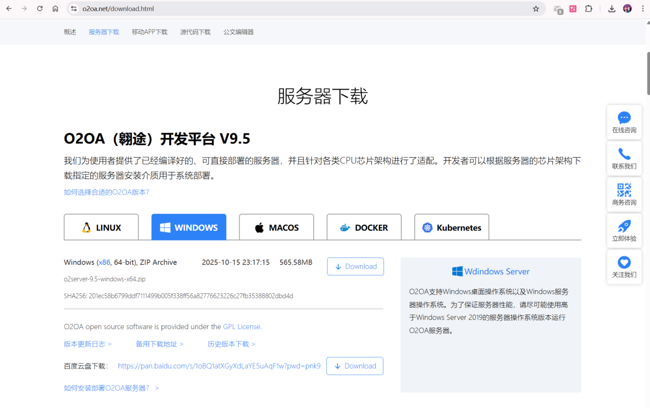 1、官网下载,一键部署:访问兰德网络O2OA官方网站(www.o2oa.net),进入“服务器下载”获取v9.5最新安装包。内置可视化部署工具,支持Windows、Linux、Docker多环境快速安装,全程引导式操作,技术人员30分钟即可完成部署。