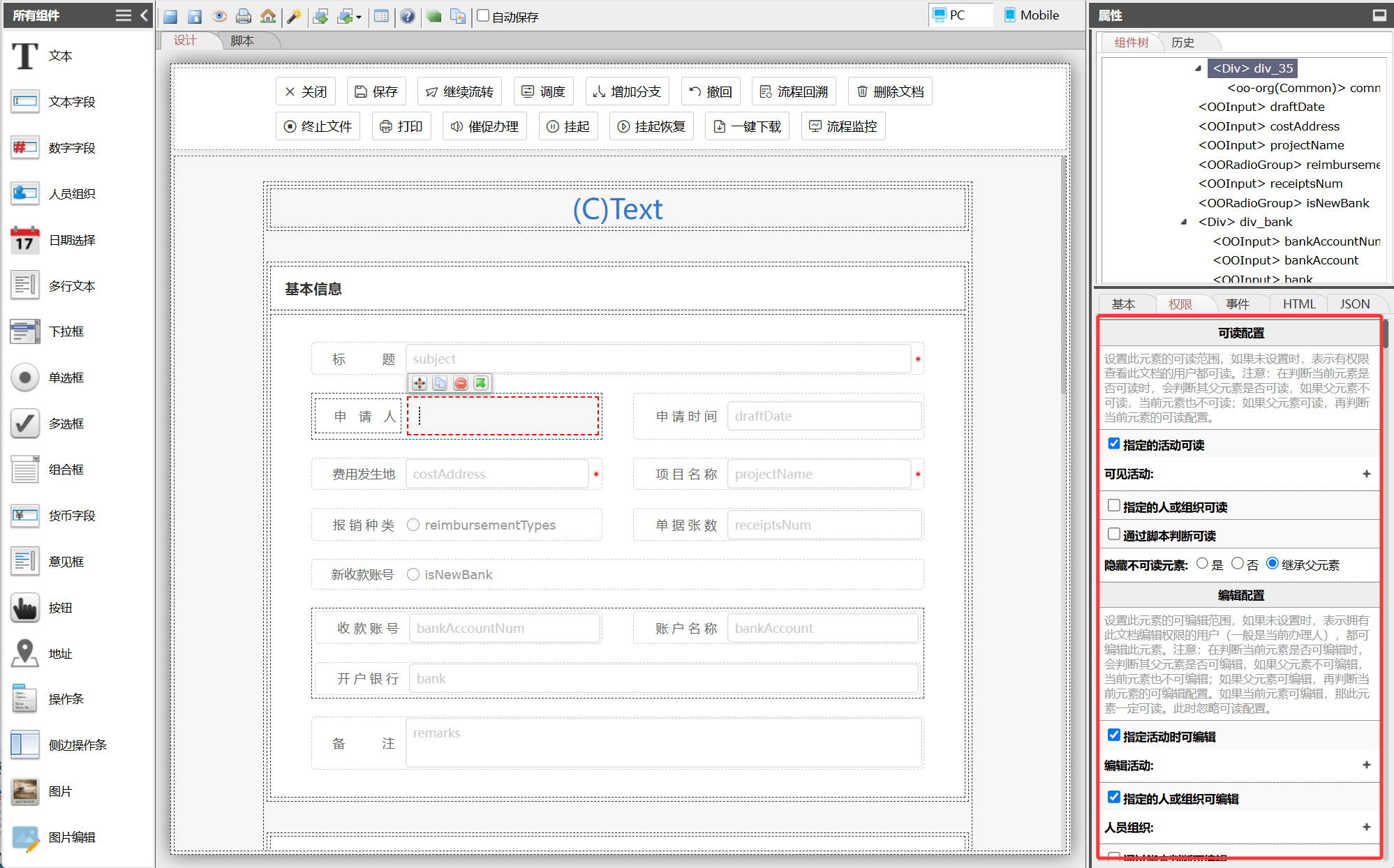 例如:财务报销单中,普通员工仅能查看金额字段,财务人员可编辑审批意见,管理层可显示隐藏的备注栏,开发量减少60%,表单维护成本降低70%。复杂表业务表单的实施效率提升更加明显。