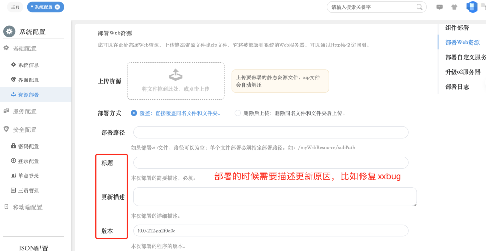 3. 增加系统部署升级记录:平台资源部署增加部署程序记录日志信息,并增加在前端部署升级o2server的功能,更加符合系统安全审计要求。