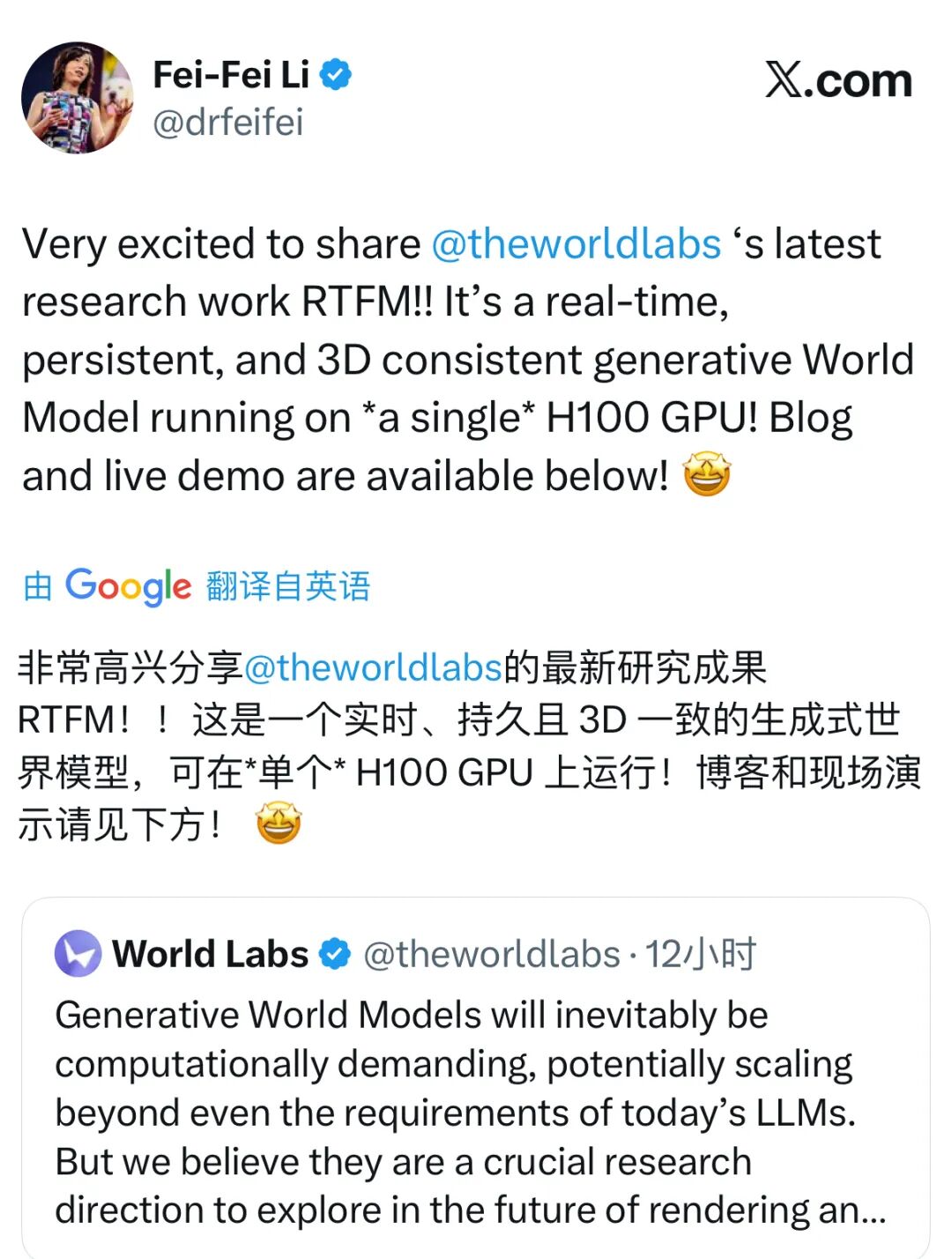 斯坦福大学教授李飞飞创业公司 World Labs 发布了全新实时生成式世界模型RTFM(Real-Time Frame Model),称这是一个实时、持持续运行且保持3D一致性的生成式世界模型,亮点是可在单个H100 GPU上运行。