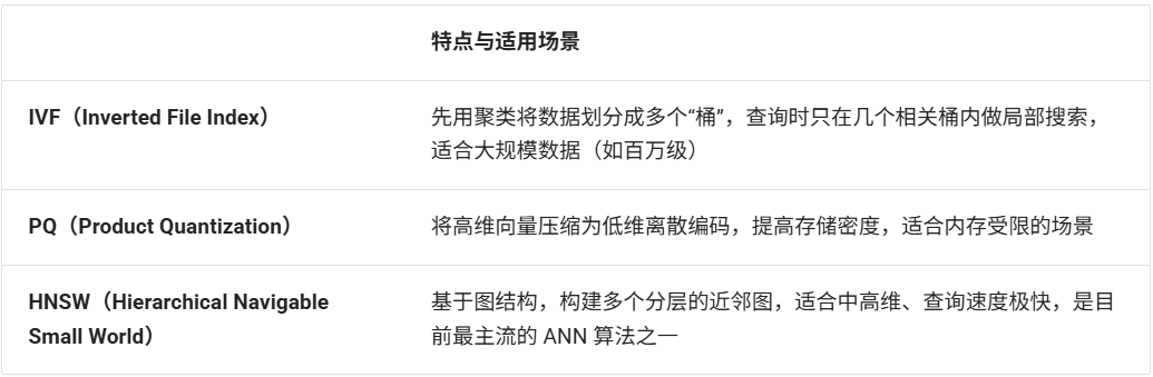 向量数据库是随着 AI 兴起而被大量使用的新型数据库,主要面向非结构化数据的特征向量存储和相似度检索任务,比如文本向量、图像向量等。这些数据通常是通过大模型编码得到的高维浮点数数组,传统数据库并不擅长管理这类数据。向量数据库专门提供了高效的向量索引结构(比如 HNSW、IVF、PQ),可以大规模数据的高效检索(有关向量索引的内容将在下一节介绍)。同时一些向量数据库也支持向量+元数据的混合过滤,方便做基于语义理解的检索、推荐与多模态问答。
