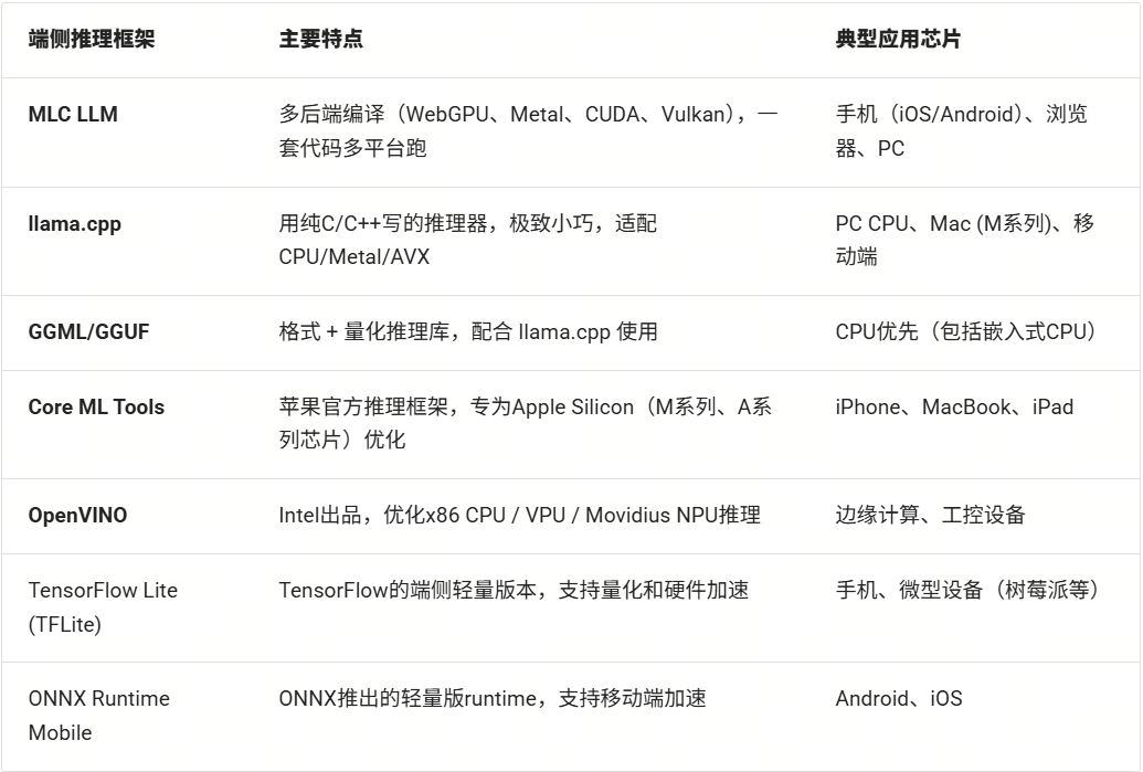 在现代 AI 应用中,GPU、TPU 和专用 AI 加速芯片是提升推理速度的关键工具。对于大模型推理而言,通常涉及数以亿计的参数和复杂的数学运算,包含大量的浮点运算,如矩阵乘法和非线性激活函数等。这些运算对计算精度和速度都有很高的要求。我们日常在个人笔记本等使用的 CPU 适合通用任务,它的核心较少,适合顺序执行任务。而 GPU、TPU 等是专门为并行计算设计的硬件,以 GPU 为例,它有成千上万个小核心,可以同时进行大量简单的计算,非常适合矩阵运算,因此深度学习推理更快,是目前主流的 AI 计算硬件。