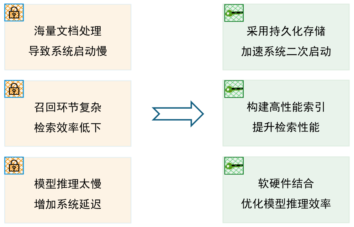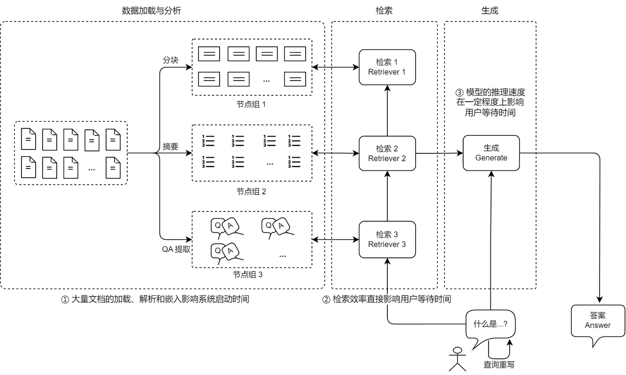 在检索召回阶段,系统存在多个检索器,系统需在不同的节点组中执行高维向量匹配、关键词匹配或QA段落匹配等操作。在这个过程当中,检索效率的高低,直接决定了用户等待时间的长短。若向量索引结构不合理或检索算法未做优化,将显著拖慢整体响应速度。