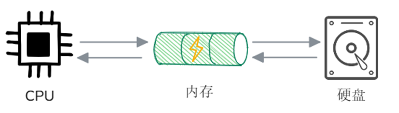 首先我们回顾一下计算机的基本工作原理,主要涉及CPU、内存和外部存储(如硬盘)三大核心组件。当计算机运行程序时,CPU 首先会通知操作系统从硬盘中加载程序至内存,程序加载完毕后,CPU 从内存中读取指令并开始执行。如果程序需要操作文件(如读取或写入),它会通过操作系统请求文件系统访问硬盘。数据会从硬盘加载到内存,程序再从内存中读取或修改这些数据,写入操作则先写入内存缓存,最终由操作系统写入硬盘,确保数据持久保存。