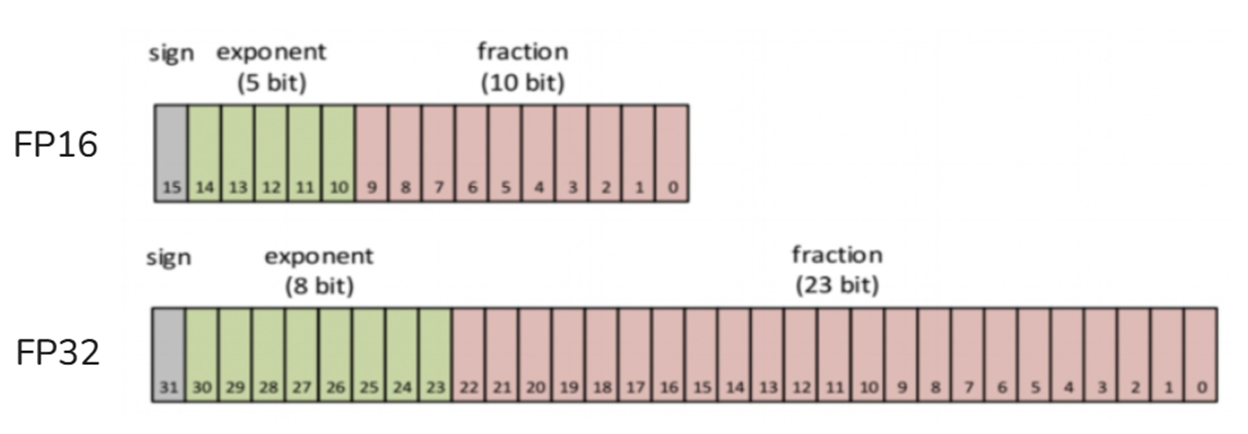 浮点数精度(Floating Point,FP):最原始的精度,由符号位(sign,正/负)、指数位(exponent,表示整数部分范围)、尾数位(fraction,表示小数部分)组成,常见精度由FP64、FP32、FP16(FP8和FP4不是IEEE的标准格式)