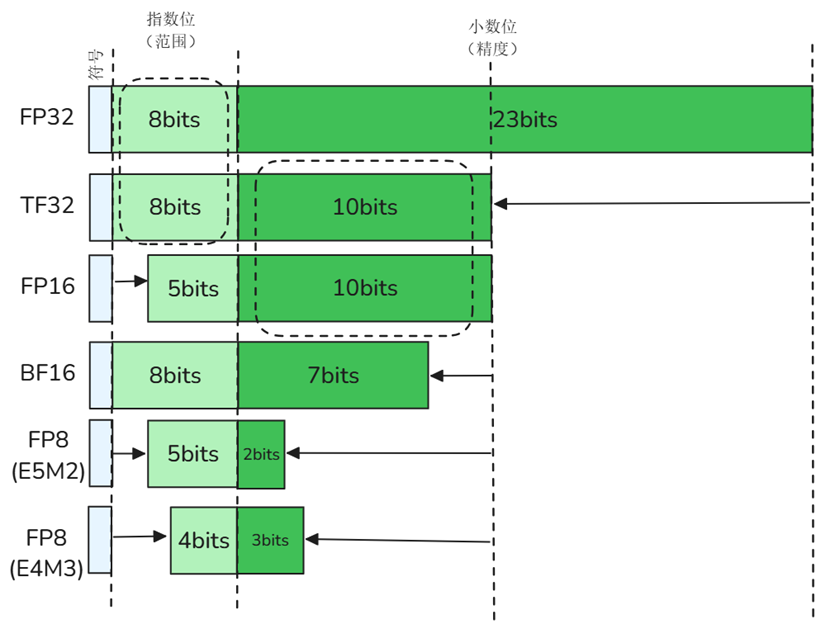 TF32:TF32(Tensor Float 32)是英伟达针对机器学习设计的一种特殊的数值类型,用于替代FP32。首次在A100 GPU中支持。其由1个符号位,8位指数位(对齐FP32)和10位小数位(对齐FP16)组成,实际只有19位。在性能、范围和精度上实现了平衡。