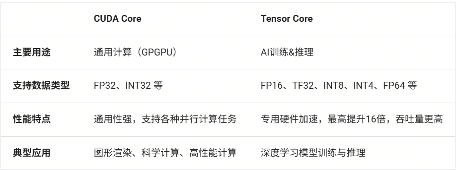 支持混合精度计算(Tensor Core):在新一代 GPU 上,CUDA 能调用 Tensor Core,用 float16 或 int8 等低精度加速计算,几乎不损失模型精度