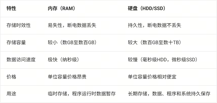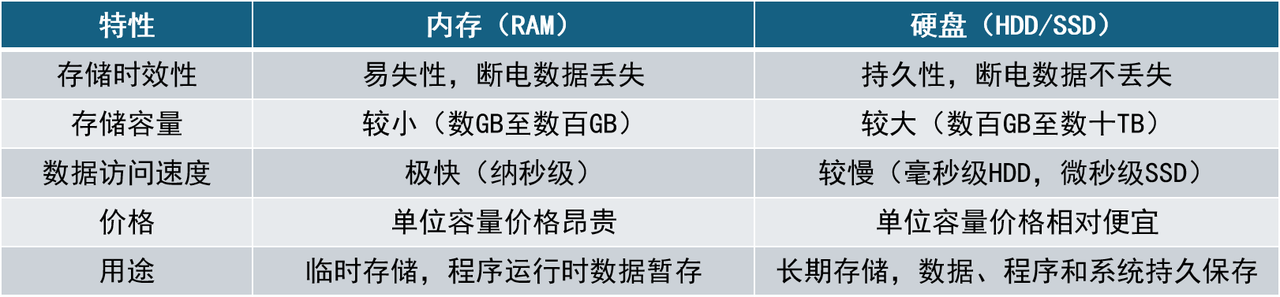 内存(Memory,通常指 RAM)和硬盘(Storage,通常指 SSD/HDD)是计算机中两种主要存储介质,各自承担不同的角色与功能。