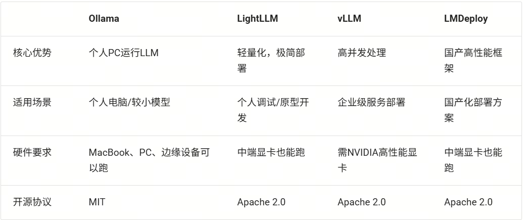 在模型不变的情况下,通过选择更好的推理框架,也可以提升大模型的推理性能。当前主流的模型推理框架有Ollama、LightLLM、vLLM以及LMDeploy等等。