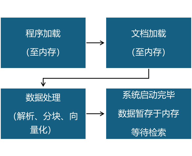 系统启动阶段:在这个阶段,程序首先会从硬盘加载至内存当中,并在加载完毕后运行。随后会进行文档入库环节,该环节中CPU会请求文件系统访问硬盘,将期望入库的文件加载至内存并读取,并在内存当中依次进行解析、分块、向量化,并在上述流程完成后,将向量与文档切片暂存在内存当中。