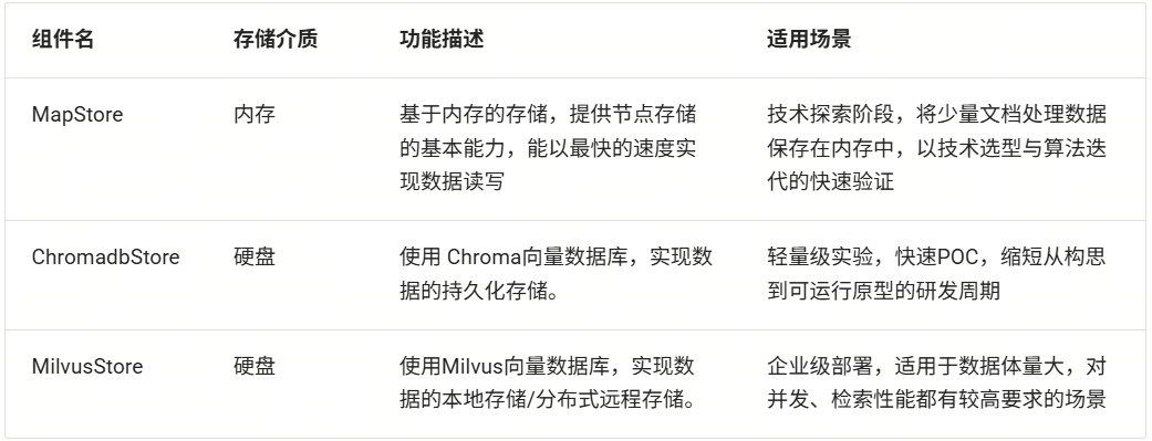极速访问能力让基于内存的文档入库及信息检索成为对实时性要求高的应用的首选,也是我们在前面的教程中将数据全部加载至内存的原因。在RAG 系统的开发初期,由于技术选型(比如Embedding模型、Reader)及系统设计(比如分块策略、节点组设计)暂未确定,研发过程中存在频繁的技术迭代,相比海量文档处理数据的稳定存储,开发者们往往更倾向于选择少量典型文档,结合先进的算法及工程优化技术,验证系统的实际表现。因此,将文本切片、向量嵌入等数据暂存于内存中进行检索,能够以最快的速度获取查询响应。
