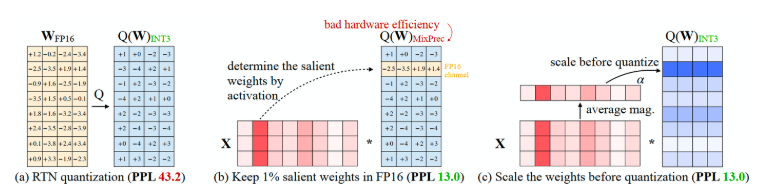 AWQ(Activation-aware Weight Quantization for LLM Compression and Acceleration)是较为常用的一种量化技术,它的原则保护更“重要”的权重不进行量化。深度学习中标准的量化流程是对所有权重进行FP16 -> INT3/4 量化,但AWQ 认为大语言模型的权重并非同等重要,有一小部分关键权重(salient weights)对于模型性能的影响远大于其他权重。如果在量化过程中跳过这些关键权重的量化,可以在不进行额外训练或回归的情况下,缓解由于量化损失导致的性能下降(即上图(b))。但这种做法会因为精度不同而导致硬件效率低下的问题。AWQ 提出了一种通过逐通道缩放来减少显著权重的量化误差的方法(如上图(c)),可以有效规避硬件效率问题。具体来说,在进行权重量化前进行通道权重计算,即每个通道的平均幅度(magnitude),得到这个权重后对通道进行缩放,然后再进行量化步骤。因此 AWQ 不依赖于任何回归或反向传播,在量化过程中需要更少的数据,并且可以将LLM的知识保留在校准集分布之外。