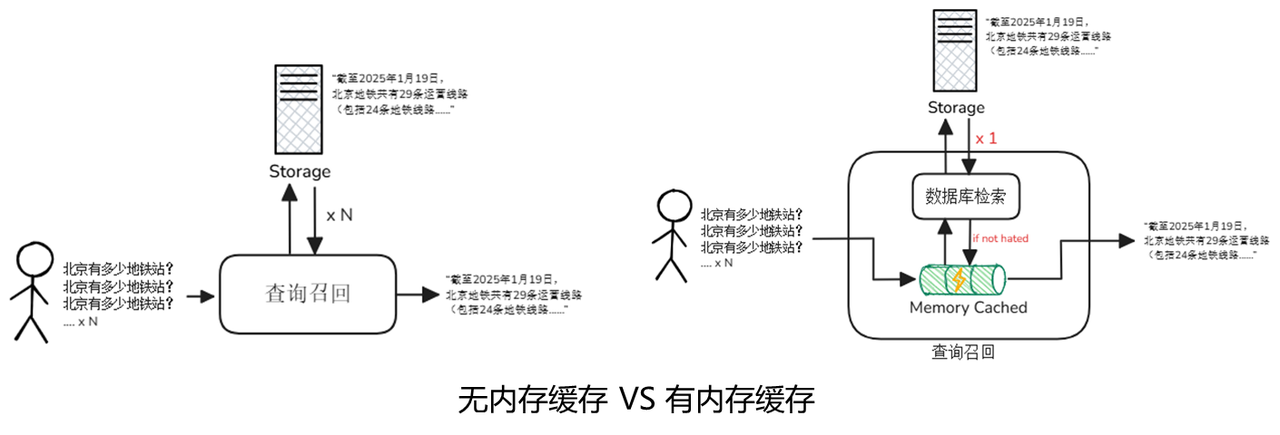 在RAG场景下,通常将“热点”数据缓存在内存中,比如经常查询的向量或检索结果,以便后续相似查询可以直接从内存获取这些数据,从而减少重复计算和磁盘I/O,从而最大程度上弥补磁盘存储的性能差距,让RAG检索既兼顾持久化又不失速度。我们假设一个检索系统中,用户频繁问“北京有多少地铁站?”,第一次处理时,系统请求数据库检索时,数据库会将相关的嵌入向量和切片数据从硬盘中读取并回答,耗时较长;随后系统将结果缓存起来,下一次问这个问题时,直接从内存中返回相关内容,大大提升了系统的响应速度。