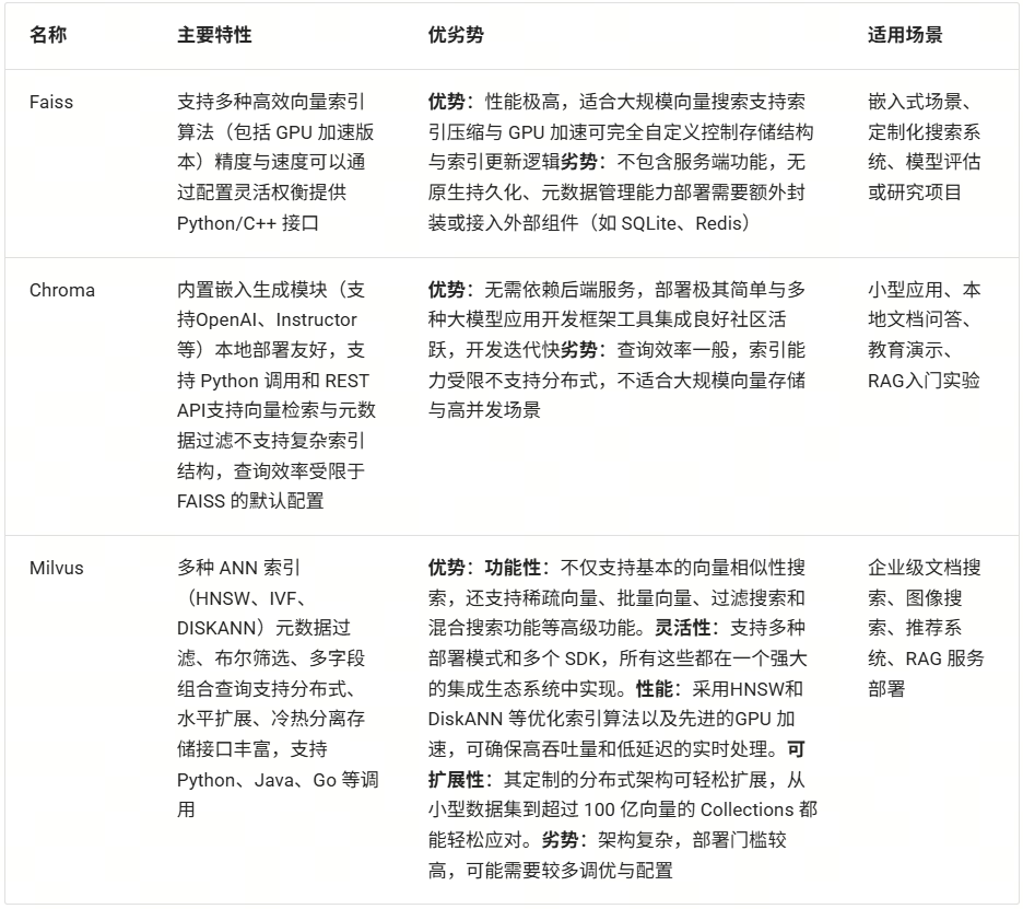 目前,已有多种成熟的向量数据库解决方案,如开源向量数据库 Chroma、Milvus等。此外,Facebook AI 提供的 FAISS 库也可用于高效向量检索,并能与持久化存储系统结合使用。其中开源向量数据库中常用的 Chroma适用于小型数据存储和快速原型开发,提供简单易用的 API,支持文本嵌入存储和相似度检索。而 Milvus 则适用于大规模数据场景,可支持 PB 级数据存储,支持分布式部署,能够满足企业级应用的需求。此外 Milvus 提供多种索引方法,可根据不同需求在查询速度和检索精度之间进行权衡。