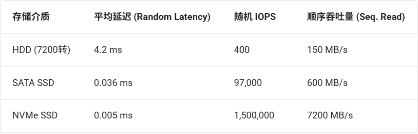 虽然硬盘与内存在速度上相差甚远,但近年来,硬盘技术从传统的机械硬盘(HDD) 到 SATA 接口的固态硬盘(SSD),再到高速 NVMe SSD,性能不断提升,主要体现在随机访问延迟和数据吞吐量两方面。HDD 使用机械旋转碟片和磁头寻道,平均寻址延迟在毫秒级别(典型7200转 HDD 延迟 4.17ms);而SSD没有机械部件,依赖电子存储单元,SATA SSD 的读写延迟可低至几十微秒(如 Intel 企业级 SATA SSD 延迟 0.036ms),NVMe SSD(尤其是采用高速总线的 Optane 类存储)延迟甚至可达到 5µs(0.005ms)。除此之外,不同介质的I/O 吞吐能力差异也很大:HDD 每秒处理的随机 I/O 操作(IOPS)上限仅几百次,而 SATA SSD 可达数万次,NVMe SSD 则轻松上百万次。下表比较了这些存储介质的典型性能指标: