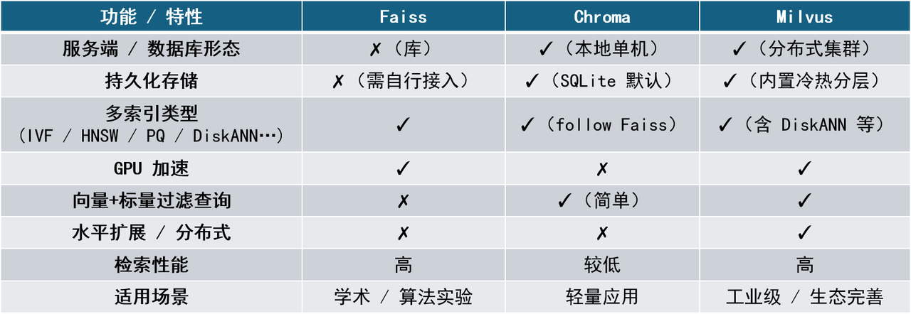 目前较为主流的向量数据库有 Chroma、Faiss、Milvus。这几款系统在检索性能、部署复杂度、功能丰富度和生态支持上各有特点,适用于不同的业务场景。以下将逐一介绍它们的定位与特点。