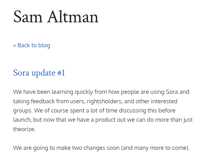10月3日,OpenAI首席执行官萨姆·奥尔特曼更新了Sora的“退出(opt-out)政策”。该政策此前允许使用知识产权内容,除非版权方明确要求禁用;新政策则赋予权利人“更精细的角色生成控制权”。