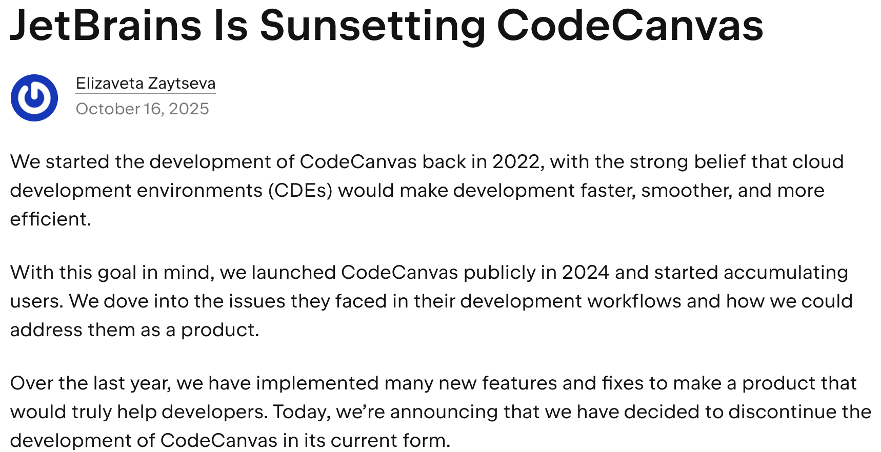 JetBrains 宣布停用云开发平台 CodeCanvas,转向 AI 驱动新产品