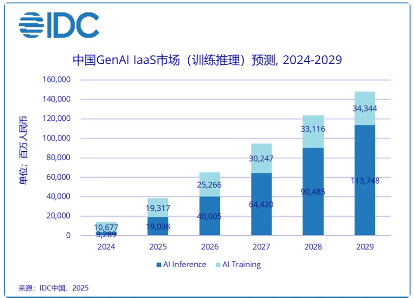 IDC中国企业级研究部分析师陈启今表示,2025 上半年,中国 AI IaaS 市场继续保持超预期增长。IDC 预测,到 2029 年,该市场规模将接近 1,500 亿元人民币,其中推理算力占比将接近八成。