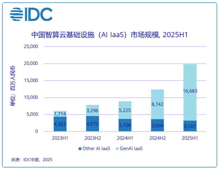 国际数据公司(IDC)最新发布的《中国智算云基础设施市场(AI IaaS)(2025上半年)跟踪》显示,2025上半年中国AI IaaS整体市场同比增长122.4%,市场规模达到198.7亿元人民币。其中,GenAI IaaS市场同比增长219.3%,市场规模达166.8亿元人民币;Other AI IaaS市场同比缩减14.1%,市场规模达31.9亿元人民币。