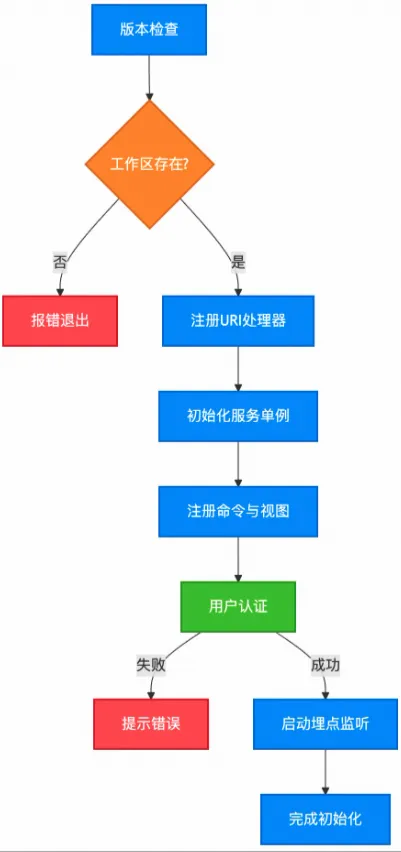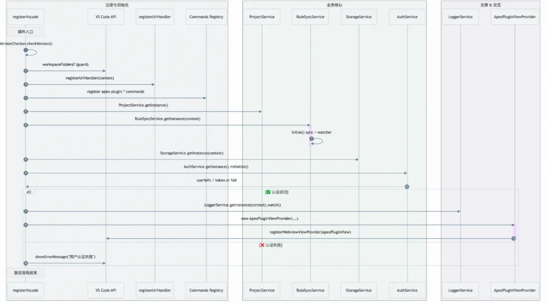 - 服务单例初始化顺序:ProjectService(工程上下文)→RuleSyncService(规则聚合/监听)→ StorageService(持久能力)→ AuthService.initialize()(异步认证获取 token 与 userInfo)。