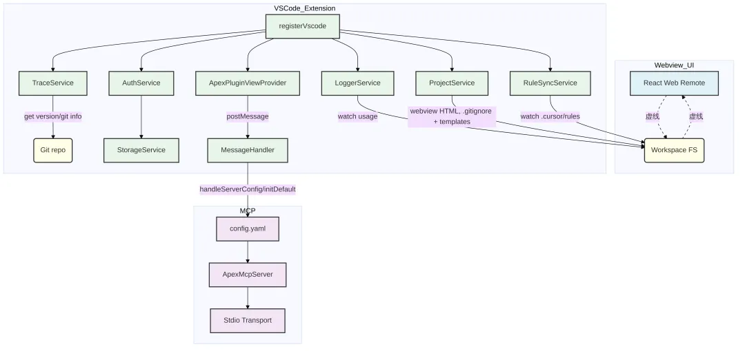 Apex 以插件为主控,Webview 承载 UI 与业务交互,服务层聚合认证、工程上下文、CursorRules知识库、埋点等能力,MCP 以“配置即工具”的方式进行边界的扩展。实现三端(插件-前端-服务端)通过版本编排解耦vscode插件的迭代周期,在安全(鉴权)、可观测(日志与活跃情况)、工程落地(规则知识库与智能体模板)之间取得平衡。