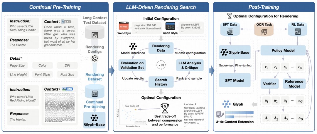 Glyph 的核心目标是让模型以“看”的方式理解超长文本。通过将文本渲染为图像,模型能够在有限的 token 数量下接收更丰富的上下文信息,实现高效的文本压缩。 整体框架包含三个主要阶段: