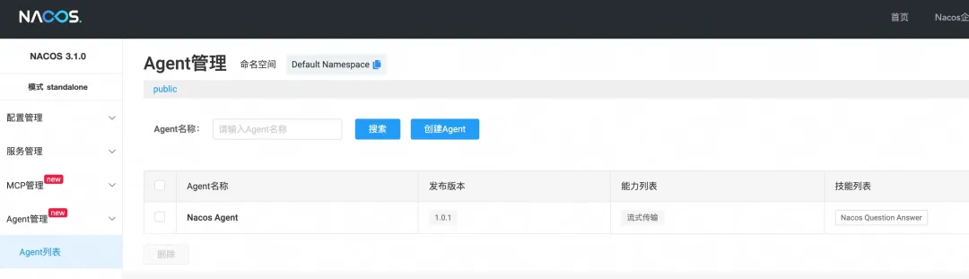 Nacos 3.1.0 首次引入 A2A 注册中心 功能,为 AI Agent 框架(如 Spring AI Alibaba)及开发者提供轻量化的 Agent 服务注册与发现能力。