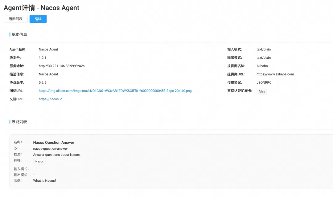至此,仅需 3 步完成 A2A Server Agent 的构建和开发,之后仅需启动即可,如使用 mvn spring-boot:run,启动成功后,在 Nacos 控制台上即可查看到注册的 AgentCard 并且能从详情中查看到具体信息:
