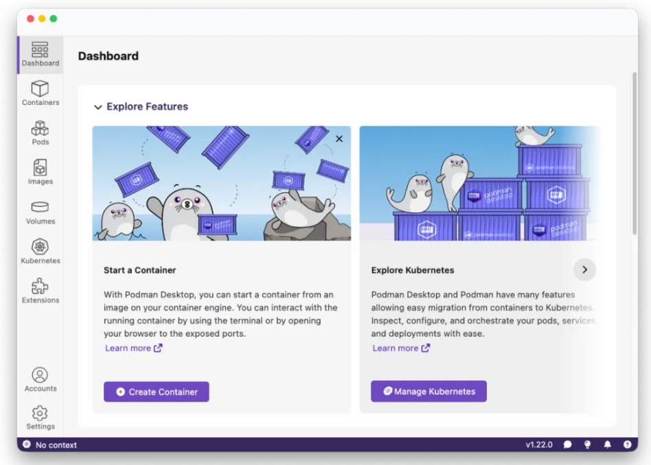 Podman Desktop 仪表盘新增“探索功能”区,帮助你快速发现和使用关键功能,提升上手体验。你可以轻松: