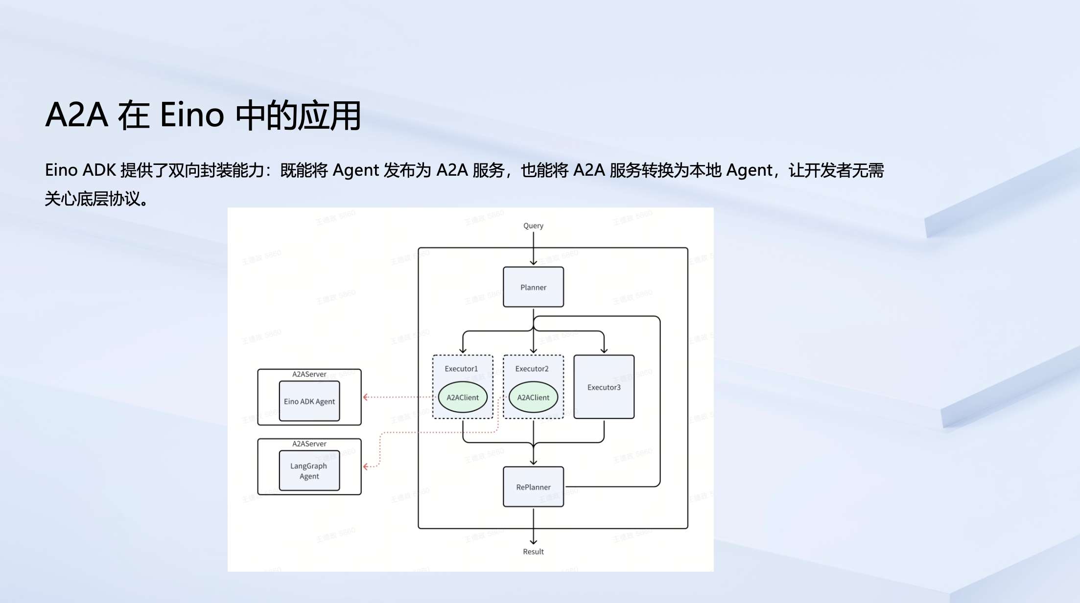 A2A 协议适配层面,Eino 支持双向封装:可将本地 Agent 发布为 A2A 服务,也能把远程 A2A 服务转为本地 Agent,开发者无需关注底层协议。例如构建旅游规划 Multi-Agent 时,Planner 生成计划、Executor 执行、Replaner 优化,流程通过 ADK 的 Planandexecute Agent 串联,同时集成远程服务。目前 ADK 已随 Eino V5.0 发布,A2A 处于 Alpha 版本,后续将持续迭代优化。