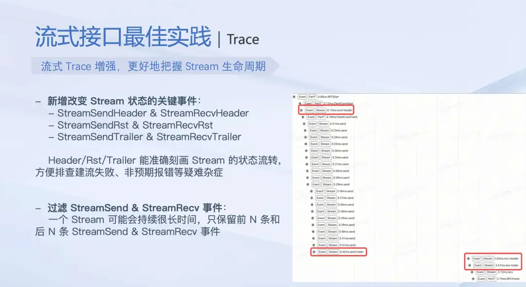 针对这些问题,Kitex gRPC 用 ctx cancel 控制 Stream 生命周期,优化 gRPC 错误描述补充关键信息,新增 Recv/Send QPS 与 Stream 状态事件完善监控;同时推出 StreamX 新接口统一 ctx 设计,拆分 Option 配置、提供三类流式中间件,自研 TTHeader Streaming 协议解决排查难题,并支持流式泛化 Server 与调试。未来计划开源最佳实践、提供 open-telemetry 版本监控、迭代协议并优化 WebSocket 适配语音场景。