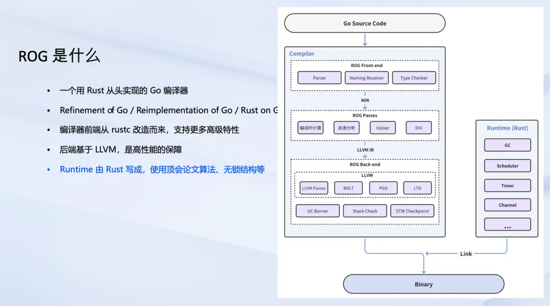 字节跳动服务框架团队研发工程师陈卓钰提出ROG 的设计源于字节内部海量 Go 服务的性能需求 ,原版 Go 编译器为追求编译速度牺牲优化空间,而 LLVM 后端具备成熟的高性能优化能力。ROG 采用 “Rust 重构前端 + LLVM 后端 + Rust runtime” 架构,既实现与 Go 100% 语法兼容,又能借助 LLVM 支持 LTO、PGO 等高级优化,结合 Rust runtime 的高效内存管理与 GC 设计,显著提升执行性能。