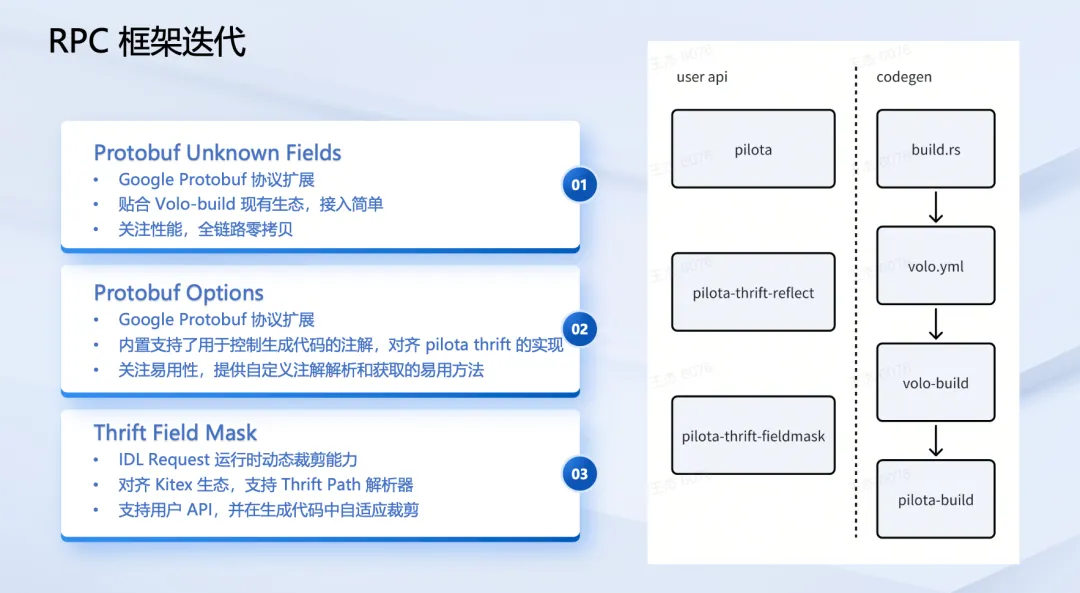 Volo 作为 Rust 微服务生态的高性能框架,通过统一抽象解耦 “协议、治理、传输”,已实现 volo-thrift、volo-grpc、volo-http 三大协议框架,配套 pilota 编解码工具、metainfo 元信息透传、volo-cli 命令行工具。