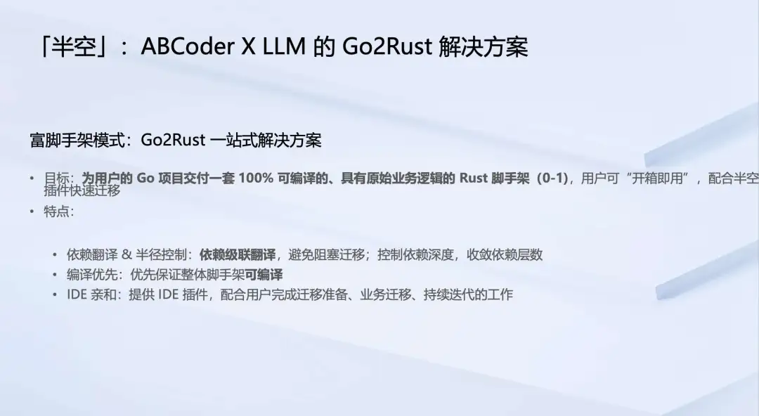 字节跳动服务框架团队研发工程师范广宇介绍到Go2Rust 源于字节内部迁移实践。ROG 能让 Go 服务 “零改造” 享 Rust 性能收益,但完全迁移需突破 Rust 学习门槛与依赖收敛难题;“半空” 富脚手架模式基于 ABCoder 工具,解析 Go 项目为带调用关系的语法树,结合大模型与迁移经验,输出 “100% 可编译且含业务逻辑的 Rust 脚手架”,支持渐进式迁移。