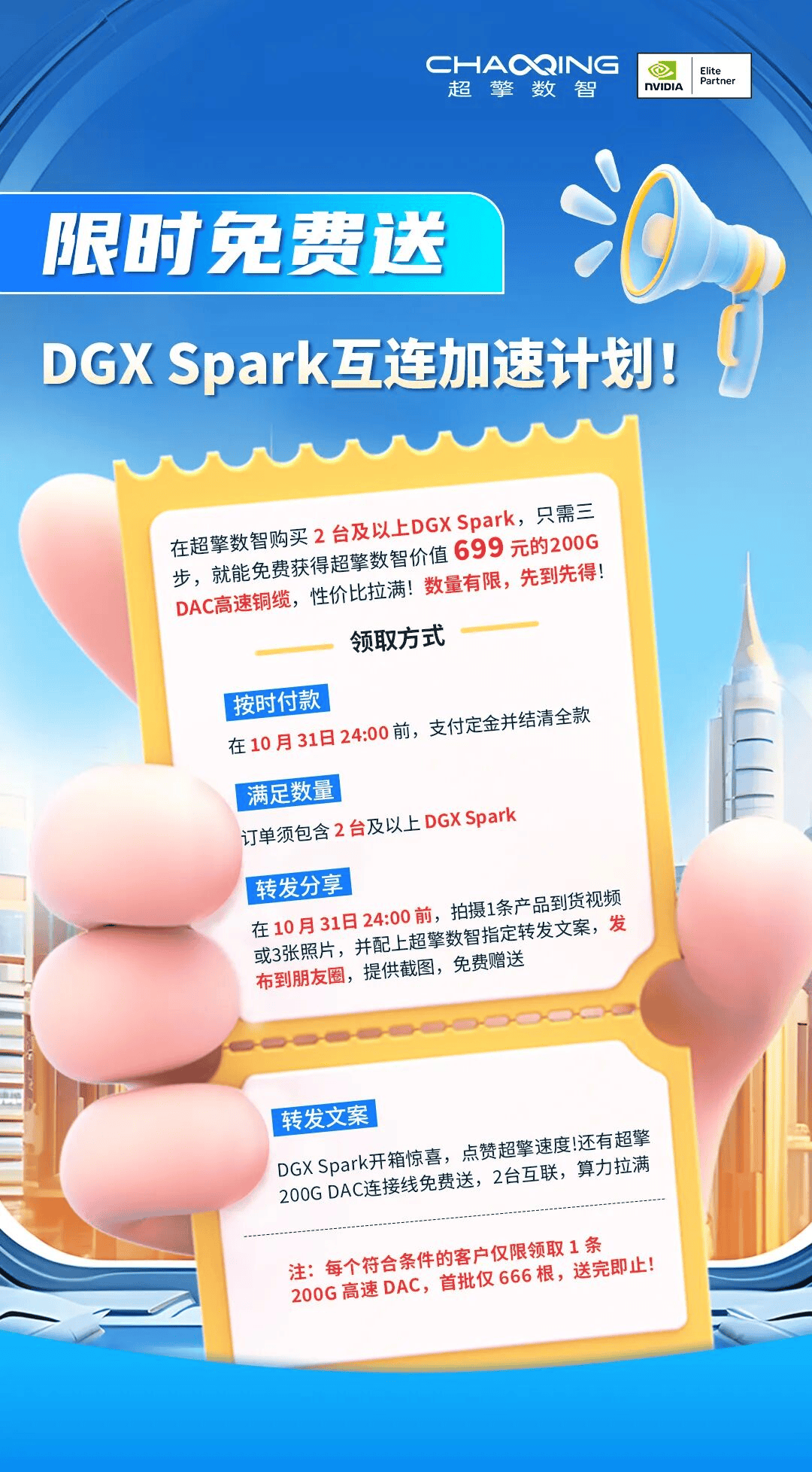转发分享:10 月 31 日 24:00 前,拍摄 1 条产品到货视频或 3 张照片,并配上超擎数智指定转发文案:DGX Spark 开箱惊喜,点赞超擎速度! 还有超擎 200G DAC 连接线免费送,2 台互联,算力拉满。发布到朋友圈,提供截图,免费赠送。