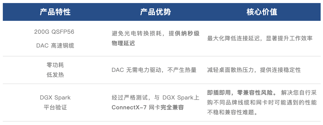 超擎数智专为 DGX Spark/HPC 场景设计了高品质 200G DAC 高速铜缆,确保您的并行计算真正实现「算力直达」,完美平衡性能与成本。