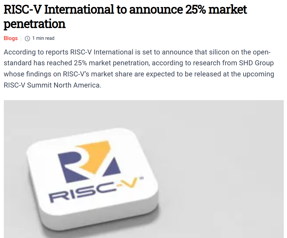 NewElectronics 报道称,RISC-V International 组织即将宣布,基于开放标准的 RISC-V 芯片市场渗透率已达 25%。该机构关于 RISC-V 市场份额的研究成果预计将在即将举行的北美RISC-V峰会上发布。