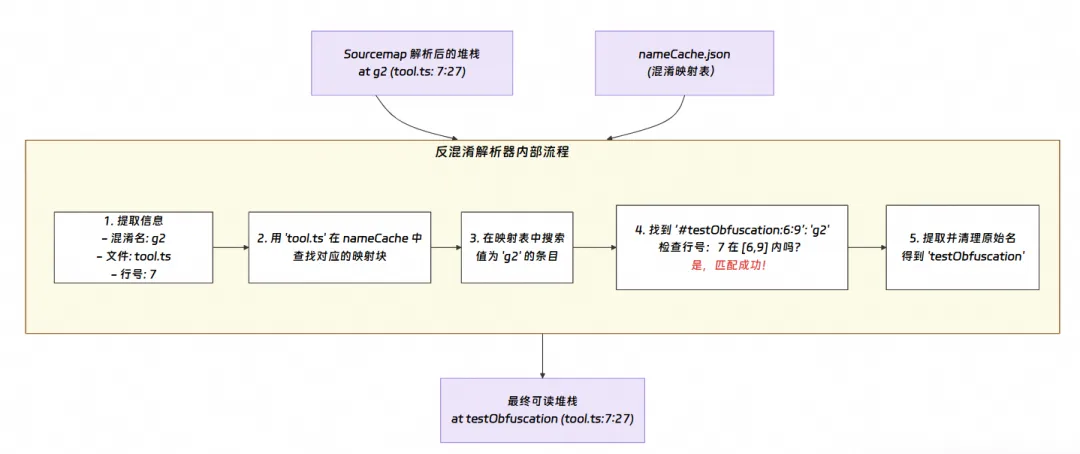 我们可以将反混淆解析视为 Sourcemap 解析之后的第二阶段精加工。Sourcemap 解决了"在哪里"的问题(文件名和行号),而反混淆则解决了"是什么"的问题(函数和变量名)。