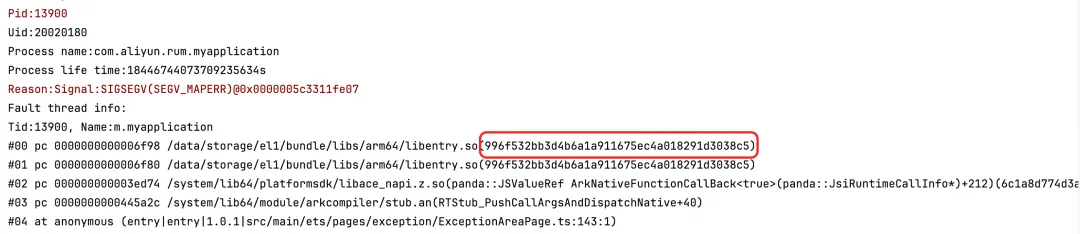 - /data/storage/el1/bundle/libs/arm64/libentry.so: 动态库路径。指明了崩溃发生在哪一个 .so 文件中。这是设备上运行时的路径。