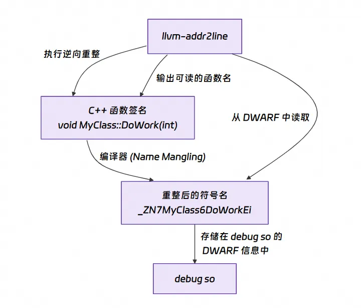为了支持函数重载等 C++ 特性,编译器会把我们写的函数名(如 OH_NativeXComponent_RegisterCallback)转换成一个唯一的、但不可读的符号名(如 _Z35OH_NativeXComponent_RegisterCallbackP18OH_NativeXComponentP29OH_NativeXComponent_Callback)。这个过程叫名称重整 (Name Mangling)。llvm-addr2line 在 DWARF 信息中找到的就是这个重整后的符号名。为了方便开发者阅读,它会执行一个逆向过程------逆向重整 (Demangling),将其还原为原始的 C++ 函数签名。