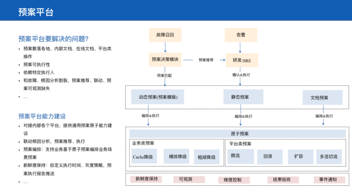 而预案平台需要解决哪些问题呢?武安闯老师指出:1、解决预案散落各地,内部文档、在线文档、平台类操作 2、预案可执行性 3、依赖特定执行人 4、和故障、根因分析割裂,预案推荐、联动、预案可观测性缺失。“所以,预案平台能力建设需要考虑以下四个方面:对接内部各个平台,提供通用预案原子能力建设;联动根因分析,预案推荐、执行;支持业务基于原子预案编排业务场景预案;自定义执行时间、灰度策略、预案执行报告推送等等”