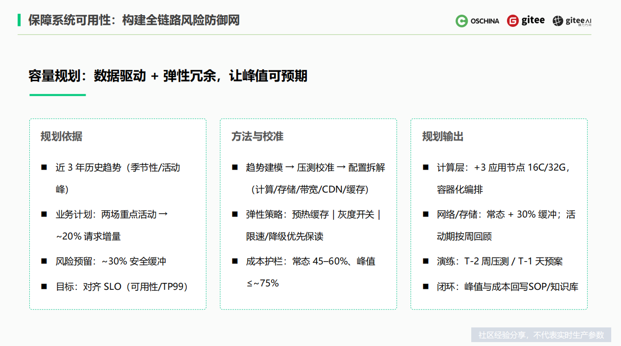 具体怎么去做呢?林师授老师提出:首先得建立全维度数据联动,消除观测盲区,在基础层秒级采样 CPU、内存、宽带、磁盘、队列等,形成稳定性基线;在业务层联动接口错误率、登录成功率、页面加载时长等用户有感指标,先判定“热点/噪声/层级”,再决策动作;在历史层,将多年的时序指标做趋势与季节性分析,最终指导容量及预算。