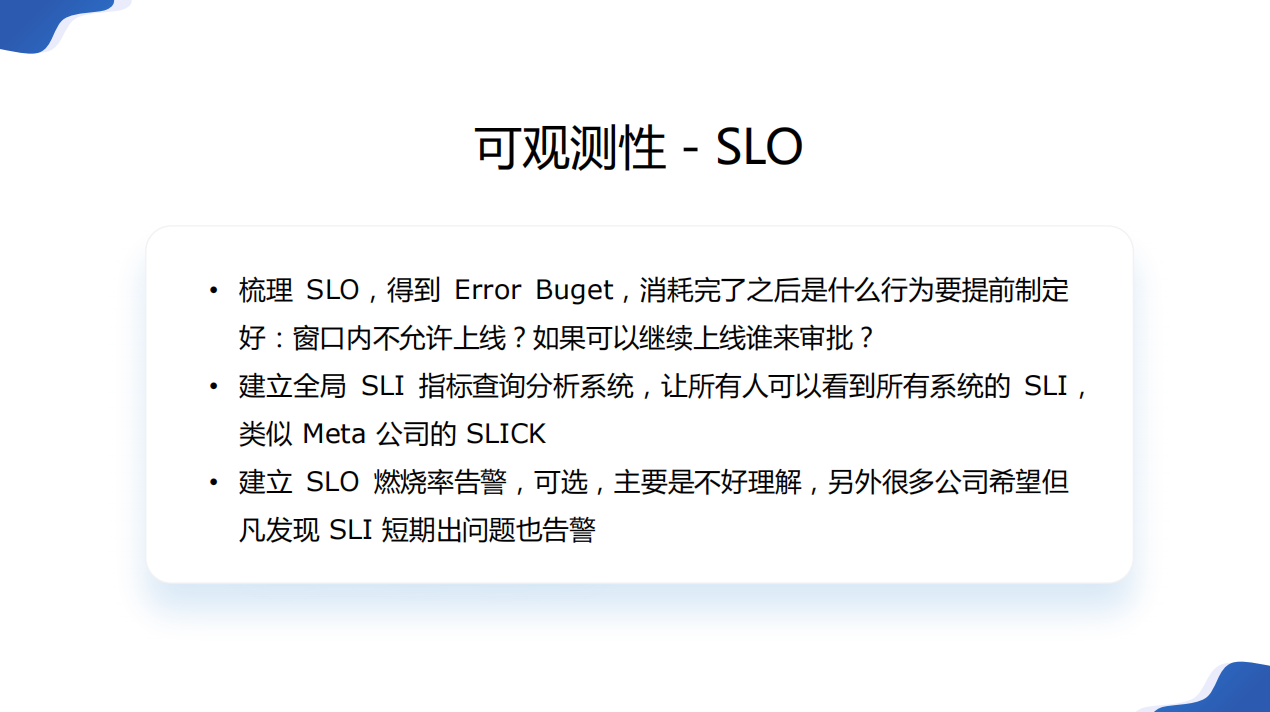 “ 可观测性,其实最核心应该从 SLO(服务等级目标)着手,需要与业务团队一起率先梳理好 SLO 。”秦晓辉老师表示,SLO 这个指标,是谁拍板呢?其实应该是业务团队来拍,而不是运维人员:根据业务的实际需要,制定出错误预算,以及预估消耗完错误预算之后,系统呈现怎样的行为,这些都是需要提前梳理的内容。