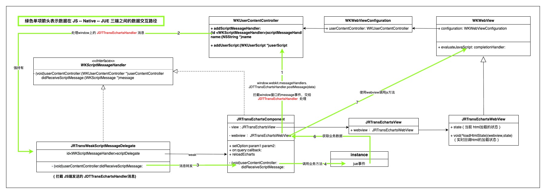 为此自定制了 JRTransEchartsWebView 专门用于渲染 echarts 数据,JRTransEchartsComponent 作为标签实现在承接 webview 和 jue 环境的数据传递和业务逻辑处理。以下类图展示了各主要类对象之间的相互关系。