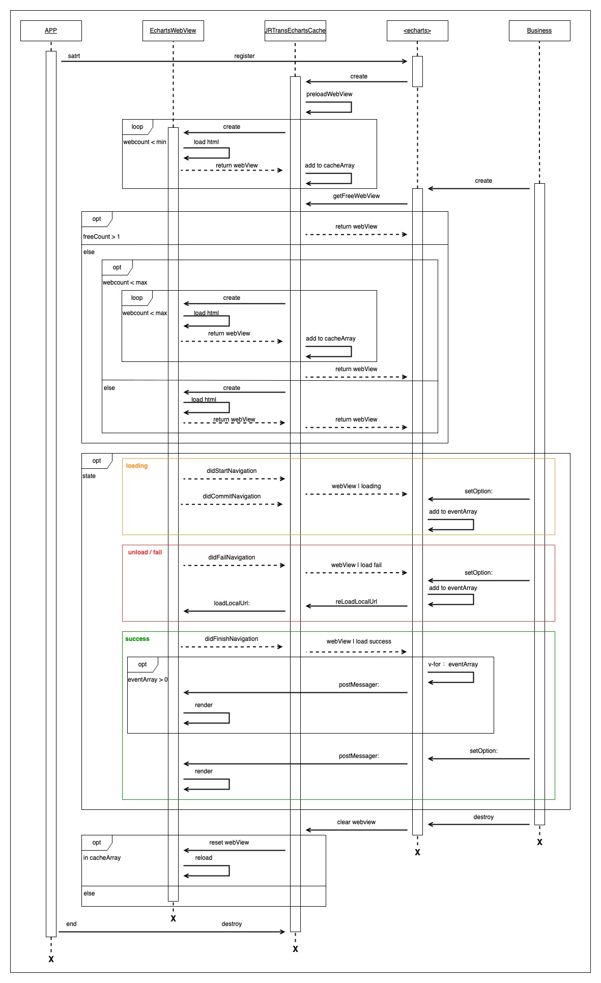 下图记录了从 App 启动到业务创建 echarts 图表,到业务退出,到 App 退出期间,融合了缓存的初始化以及自动扩容,包括在 webview 加载 echarts.js 资源的不同阶段对渲染指令的处理,以及视图销毁后的内存处理等场景下的处理流程。