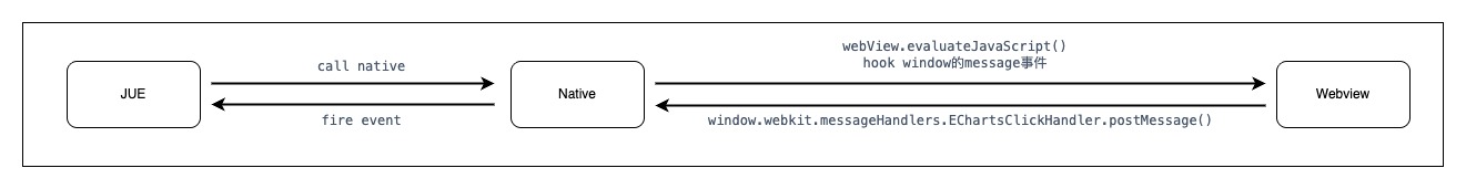 以上,JUE 通过调用 call native 将数据发送到 Native,Native 通过 window.dispatchEvent 的方式将数据传递给 WebView。而图表上的手势交互等事件 WebView 通过 postMessage 的方式发送,在 Native 监听指定类型的 message 获取数据,通过处理并通过 fire event 触发到 JUE。
