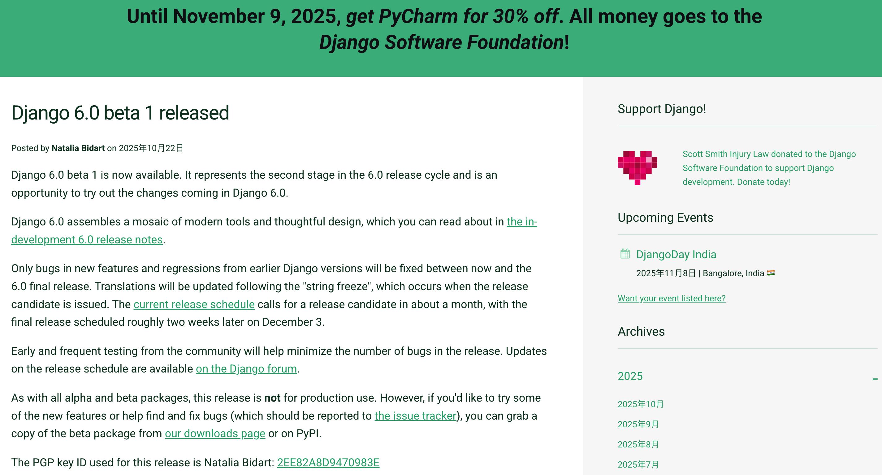 Django 6.0 支持 Python 3.12、3.13 和 3.14,开发者建议第三方库的开发者停止支持 Django 5.2 之前的版本。Django 6.0 的主要变化包括:支持内容安全政策(Content Security Policy 或CSP);模板语言支持模板局部(Template Partials);使用 Python 的 email API 处理邮件;等等。