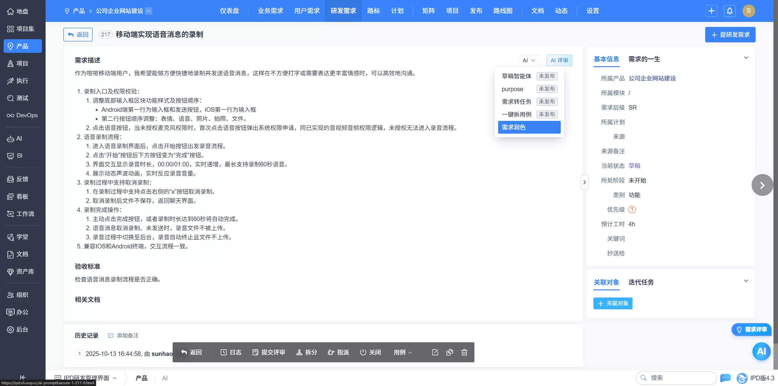 禅道智能体应用返回的结果通过AI智能小球呈现,可继续返回到相应表单。